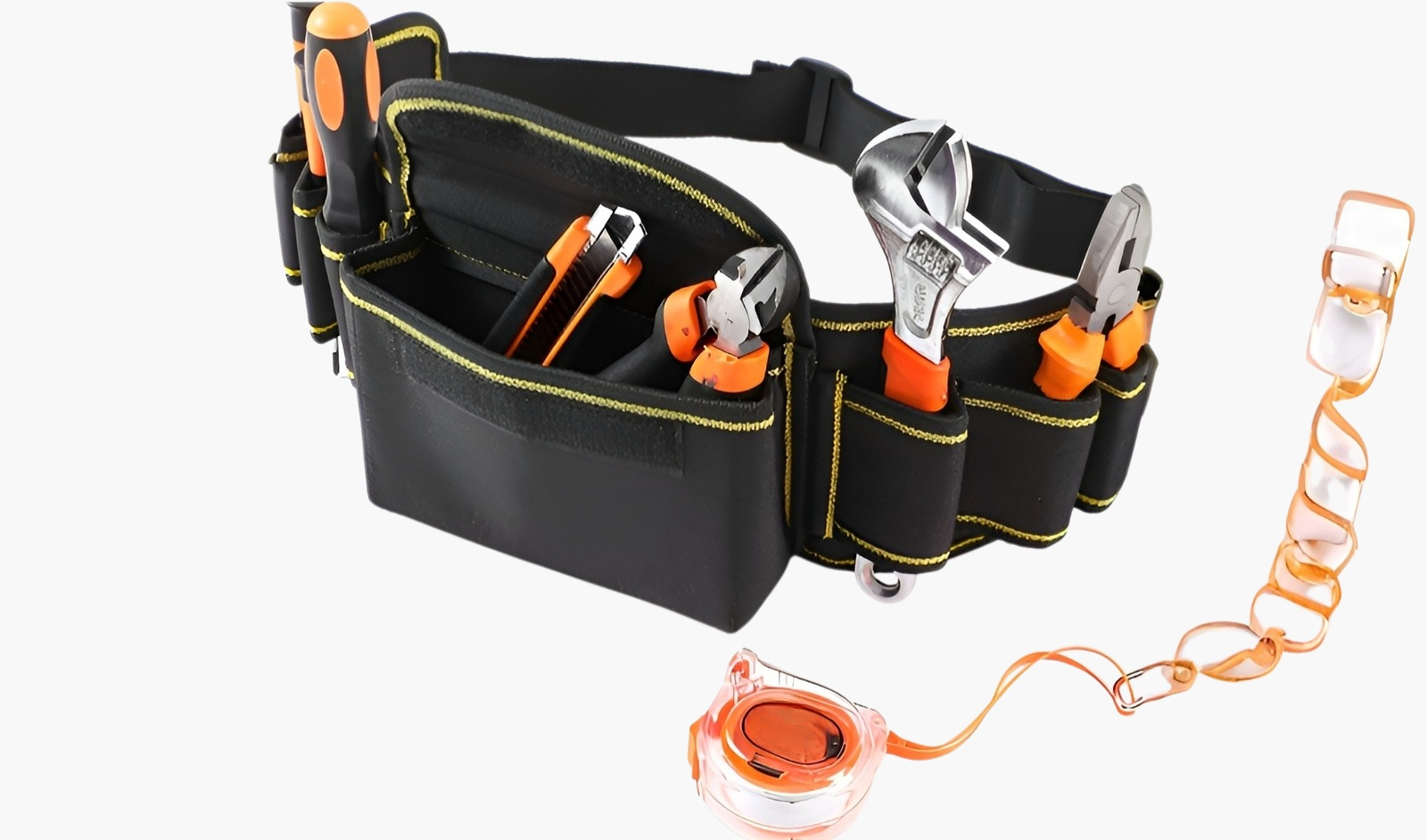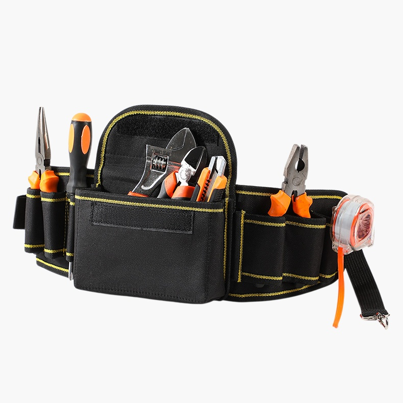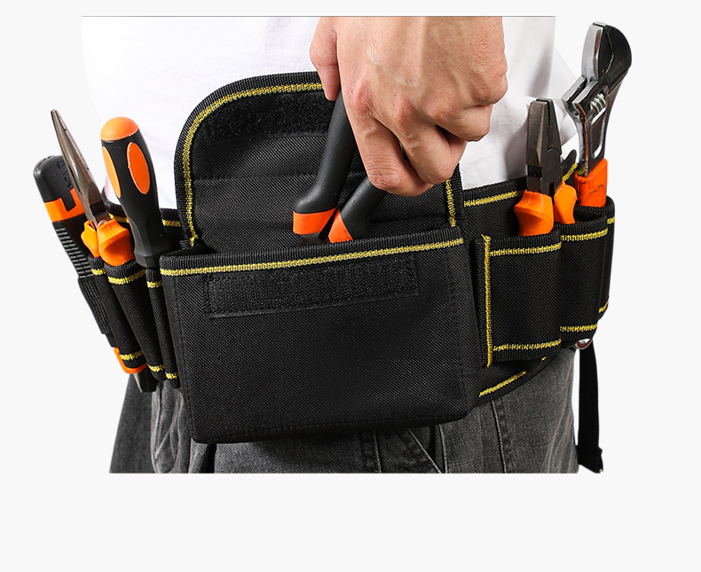 Durable hardware tool waist bag with multiple pockets, adjustable belt, and reinforced stitching for secure tool storage and easy access during work.